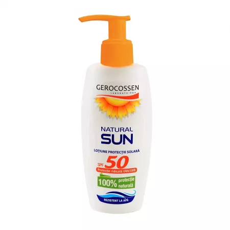 Lotiunea de plaja Natural Sun cu SPF 50 protejeaza pielea de efectele negative ale radiatiilor UV. Contine un sistem de protectie 100% natural pe baza de filtre minerale in asociere cu 3 uleiuri protectoare: ulei de karanja, ulei de morcov bogat in beta-caroten si ulei de masline.
